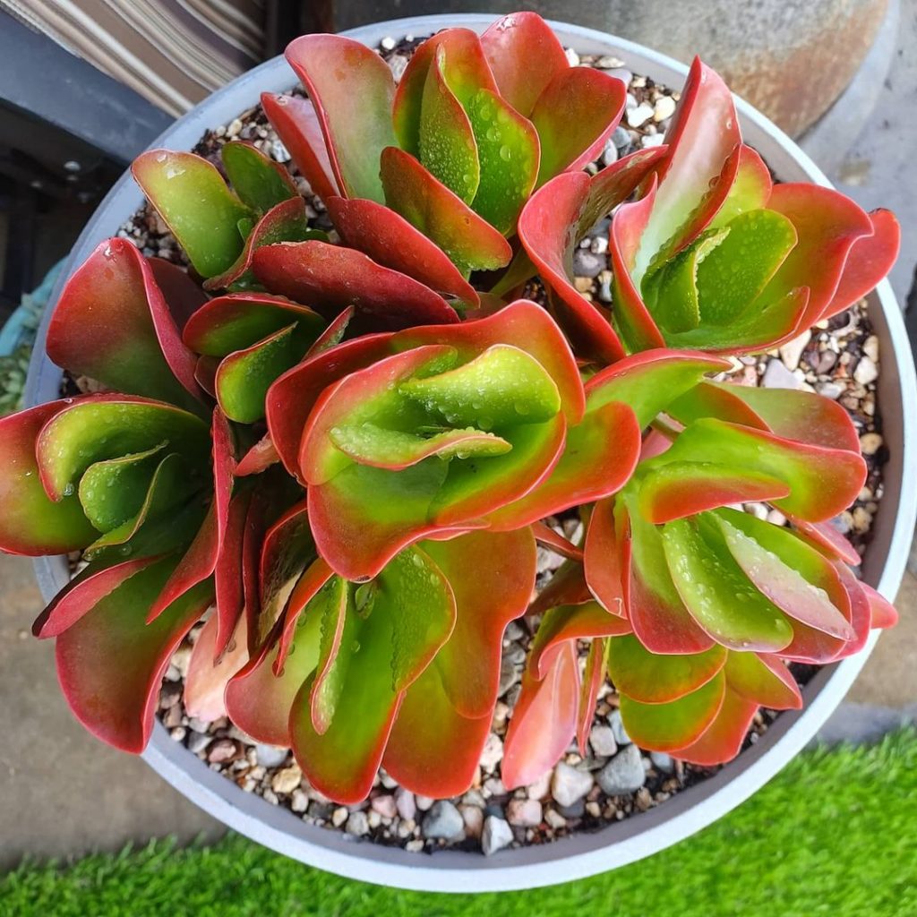 Kalanchoe Dragonfire consta de hojas de color verde manzana con bordes rojos. A la luz del sol o en climas más fríos, las hojas se sonrojan intensamente. Si tu suculenta se vuelve más roja y la parte verde solo se ve en el medio. Este tipo de planta tiene un crecimiento robusto y rápido y alcanza una altura de hasta 10 a 15 cm. Kalanchoe Dragonfire es un nuevo tipo de suculenta de la variedad Kalanchoe. Está formado por hojas y tallos gruesos, carnosos y jugosos. Aunque esta planta no produce flores, aún así tiene una apariencia hermosa. Kalanchoe Dragonfire es una adición común a jardines y paisajes suculentos.